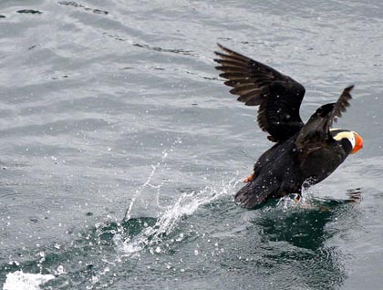 After our welcoming by park ranger Nicole Schavue and Tlingit elder Bertha Franulovich we were invited up on deck for our first stop at Marble Island a well known bird rookery and haul-out for Steller sea lions. Tufted puffins, pigeon guillemots, surf birds, kittiwakes, black oystercatchers and a lone immature bald eagle all flew in and out as National Geographic Sea Lion sat just off the eastern side of South Marble Island. Both ends of the island had sizable groups of Steller sea lions hauled out, adding to the cacophony of sounds. Continuing our northerly passage, National Geographic Sea Lion headed back out into Tarr Inlet, making way towards Tidal Inlet and Gloomy Knob. Weather had arrived and a soft mist had turned into a good early summer rain.
