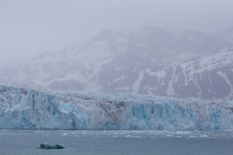 Later in the morning, Plan C materialized as we spotted some whales and it was time to enjoy a bit of whale watching. Two humpbacks were feeding on krill just below the surface, spending long periods of time at the surface. One of them had a very interesting tail as part of the left tip was missing—probably the result of an encounter with killer whales. Then it was back to Plan B as we cruised close to the glacier at the end of Cumberland Bay. Nordenskjöld Glacier is at least a mile wide with a towering face. Many icebergs were floating in front of the face, and the glacier disappeared far into the mist and fog. This was a very nice alternative for sure.