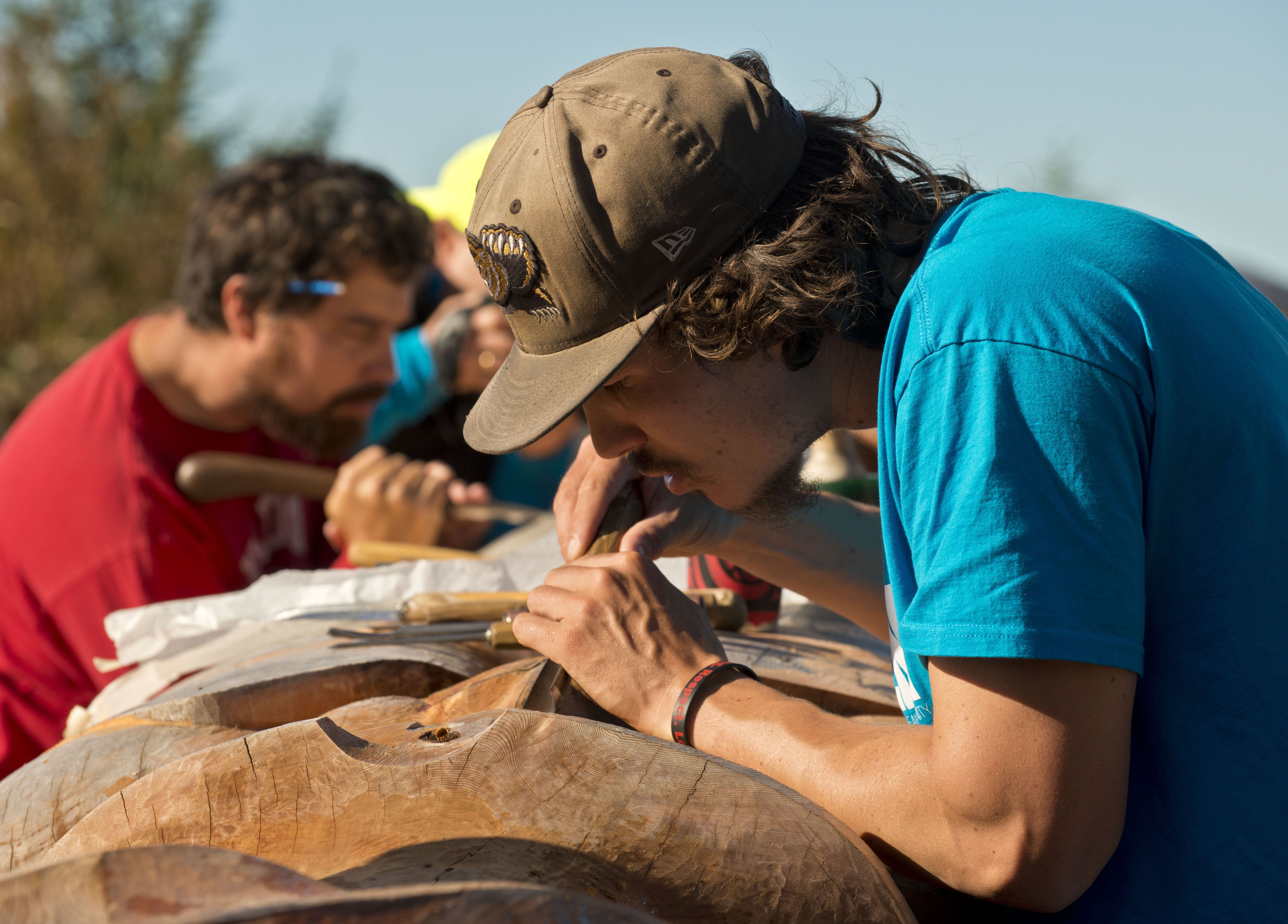 The windows of National Geographic Sea Lion were dark when many of us made our way up or down into the forward lounge. Dawn’s first light was just making its way over the eastern edge of a point called Sandspit. Pink clouds began reflecting on the calm seas, clear skies opened up above and slowly, sunrise began to decorate the harbor of Queen Charlotte City. Our plan for the day was a drive north along the entire length of Graham Island along the only road leading to one of the oldest village sites in Haida Gwaii the town of Old Massett. We boarded two busses and one van and began our journey north, arriving in the late morning. Once in Old Massett we divided into two groups according to bus colors and one group headed to the north end of town to James and Rosemary Hart’s house. Upon arrival we were greeted by Rosemary who invited us to come into the carving area, which consisted of a huge outside area just next to their house where an enormous and complex totem pole was nearing completion. At least six carvers were at work on this reconciliation pole which has been planned and worked on for over two years! James Hart a hereditary chief and master carver jumped up on one of many large blocks of wood and began a wonderfully detailed description of the work in process. Questions flew through the air along with wood chips and under warm and blue skies we were taken into the spell of a working village completely immersed in Haida culture. Each carver, each family member, each neighbor came forward to share conversation with us.