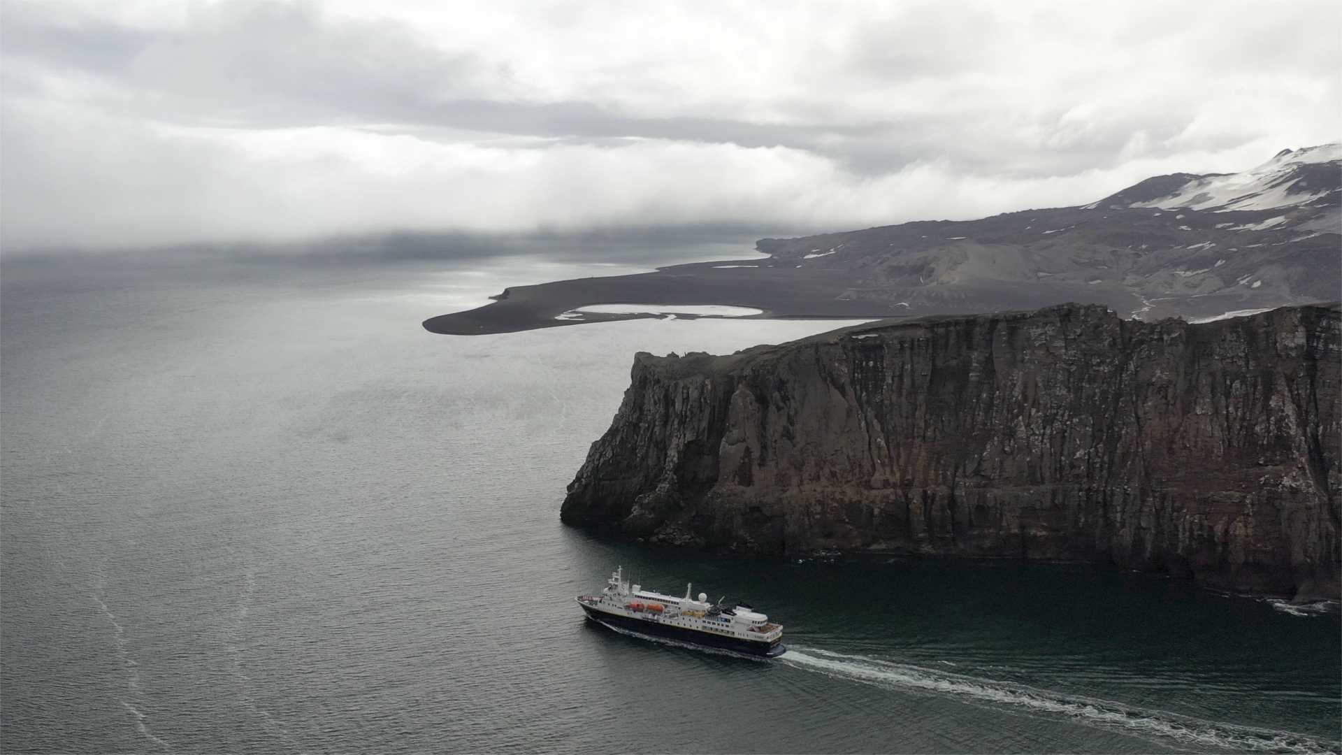 In the early morning hours, the gentle sloshing of the Drake Passage gave way to smooth waters as we sailed through fog on the northern waters of the Antarctic Peninsula. Eager to stretch our legs after a long crossing, we piled ashore at Half Moon Island. A sizable colony of chinstrap penguins greeted us. The stark gravel banks and guano-stained snow of this landing offered us an introduction to classic Antarctic ambiance. Guests diligently adhered to the IAATO guidelines, scrubbing their boots with great concern upon returning to the ship. In addition to keeping invasive species at bay, we are also keeping the hotel department happy; penguin poop makes a terrible addition to the ship’s carpets.