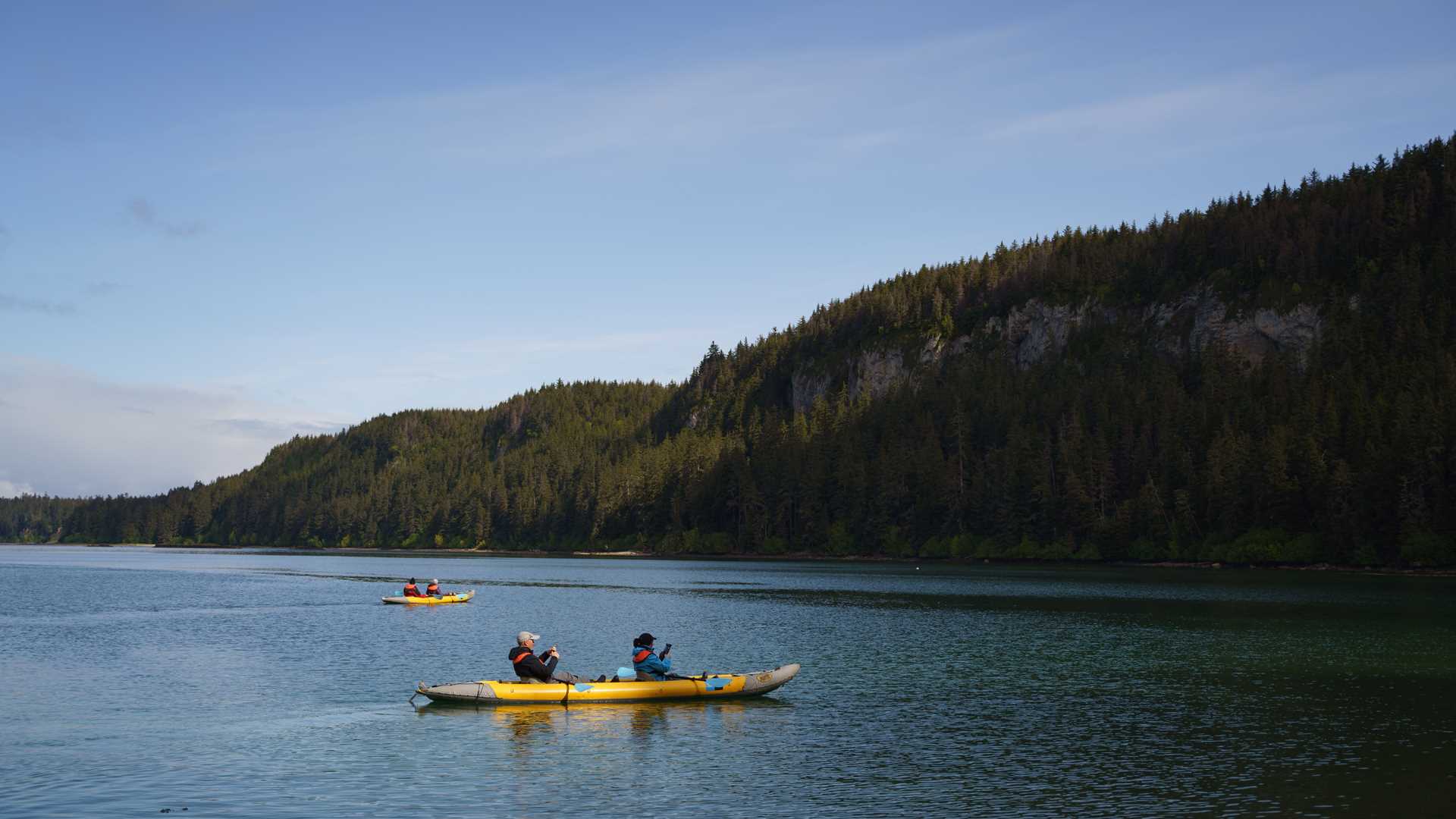 Today’s weather was just about as nice as we could have asked for here in Southeast Alaska. The morning was calm and moody, but as the day went on, the clouds burned off and left us with some blue skies and sunshine. Guests had the chance to kayak and hike inside the scenic bay of Hallack Harbor on Kuiu Island. We then lifted the anchor and headed up Chatham Strait, finding a few humpback whales diving and swimming in the late evening.
