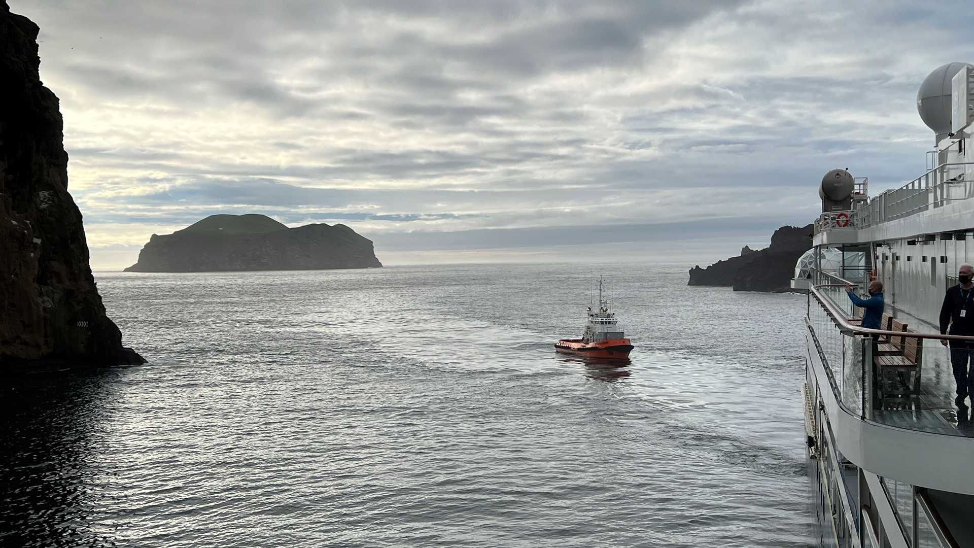 What a glorious and bright sunshiny day in the Vestmannæyjar (Westman Islands)! We sailed in early to Heimaey, and with the assistance of a local pilot, Captain Heidi spun the ship in place and expertly backed National Geographic Resolution alongside the dock. From here, we set out on our hikes and tours. The more adventurous among us hiked up Eldfell Volcano while others enjoyed coach tours of this beautiful and geologically very young island. On the tours, we saw volcanoes, puffins, and adventurous mountain-climbing sheep as well as beautiful landscapes and seascapes all around. We all visited the superb Eldheimar (Fire World) Museum that describes the unexpected 1973 eruption of Eldfell Volcano. In the afternoon, we sailed south into Vestmannæyjar and circumnavigated the famous Surtsey for which all volcanic eruptions of its style are now named. We also visited a gannet colony where the cliffs and the air were filled with gannets.