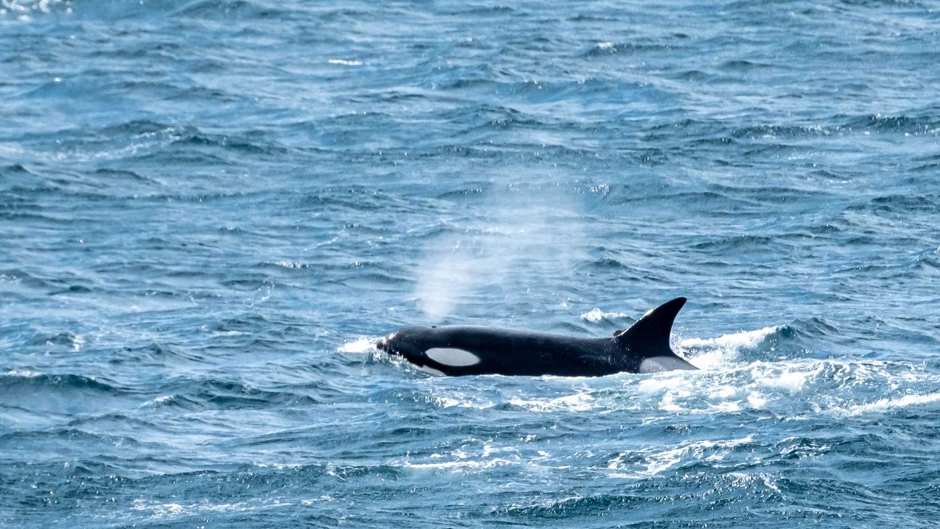 In the afternoon, we began cruising through the Gerlache Strait hoping to find a few cetaceans to add excitement to the day. We employed our best technique to bring these wonderful animals out of hiding, a naturalist giving a presentation on whales. Our resident whale expert and naturalist, Connor Ryan, began a wonderful talk on whales of the Southern Ocean only to spot out of the corner of his eye a Type A killer whale swimming in the distance. Having successfully lured the whales closer, we put Connor’s talk on hold to maneuver the ship closer to get a better look at these magnificent animals. After an exciting viewing of the killer whales, Connor finished his talk and we continued to make our way north in preparation for an after-dinner excursion.
