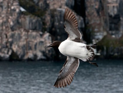 Seabirds are adapted to a life out in the ocean, so very different from us very terrestrial species. The only reason for them to come ashore is that none of them have been able to find a way to breed out at sea. Thick-billed murres belong to the order Alcidae (auks) and very much occupy the same niche as penguins in the Southern Ocean but are not related. Most important, the auks have adjusted to maintain flying in the air but also do fly, as penguins do, under the water, using their wings. Here in the northern latitudes (North Atlantic & Pacific) you find the auks with several species, but they all have to deal with land predators, a good reason to be able to fly up to an inaccessible cliff ledge to avoid predation of the egg or chicks. At first as you see them take off they seem to be clumsy but as soon as they are up in the air space they flap their wings like a bumblebee and make good speed. Landing is maybe not so gracious, but still they manage to land on narrow cliff ledges.