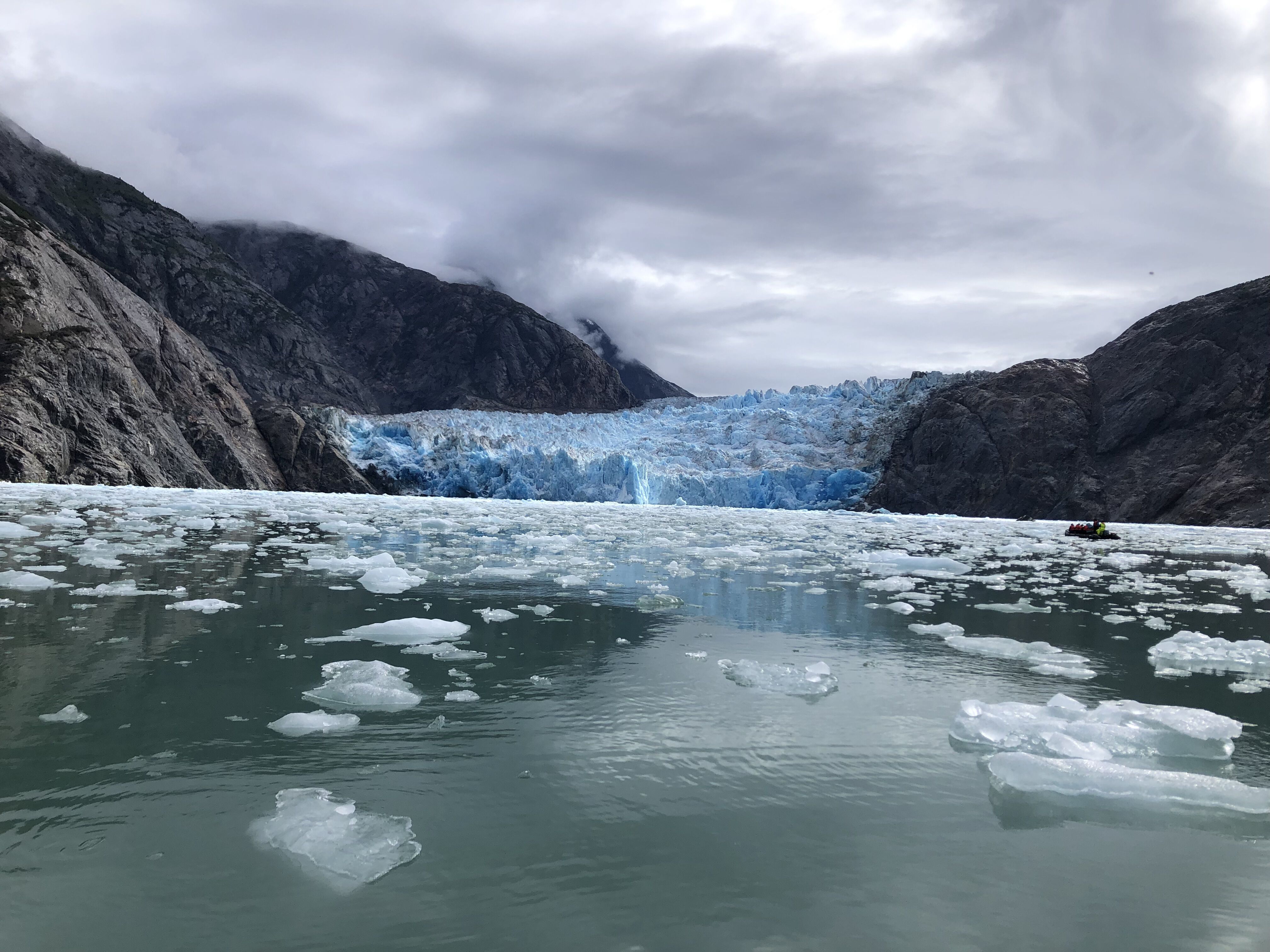 Our last day began quiet and still as a light drizzle fell, and broken, misty clouds hung low over the water. We crossed the shallow bar in Holkham Bay into the long fjord of Endicott Arm. The narrowing marine pathway winds more than twenty miles deep into the mountain wilderness on the border of Southeast Alaska and British Columbia. Carved thousands of years ago by the Dawes Glacier, we sailed near the face of the current glacier terminus.