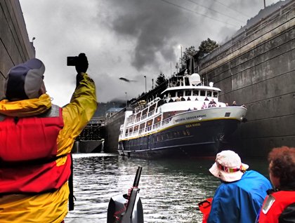 We zipped just ahead of the National Geographic Sea Bird and then acquiesced the lead as she entered the lock and secured to the floating bollard. While we dropped the seventy feet to river level there was a bantering of songs between the guests in the landing crafts and the guests remaining on the National Geographic Sea Bird. We started with “Roll on Columbia” and eventually digressed to a variety of ancient popular tunes.