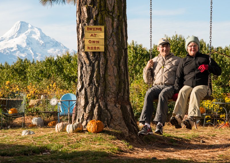 We could not have asked for a more beautiful day today! The morning was a bit rugged in terms of temperature though – early morning stretch class managed to survive 38 degree shivering and eagerly came inside for breakfast. We boarded our buses at the Hood River marina and headed in different directions. One group journeyed into the Hood River valley, a lovely area of mixed forest and agriculture known as "the fruit loop." We stopped at the Draper Girls Country Farm for a really fun time – petting baby goats, photographing ice-covered dahlia blossoms, swinging on a board swing, and sampling apples, pears, and cider. The other half of the group went to the Western Antique Airplane and Automobile Museum, which has a jaw-dropping spread of old cars and airplanes that are fully operational. The docents who guided us through are the folks who have repaired and driven/flown the museum pieces – a great way to experience the place. Many of us walked around town before lunch to experience downtown historic Hood River.