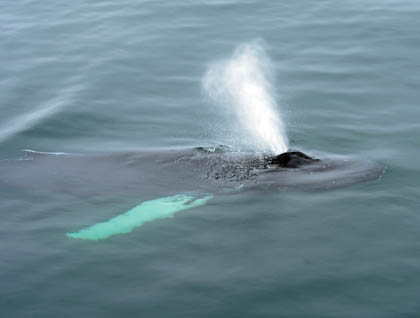 During the morning we anchored in Hornsund on the western side of southern Spitsbergen. A young humpback whale was spotted just as it broke through the calm water. Many guests appeared on the front deck, eagerly clicking their cameras. Thanks to Captain Oliver, the ship was gently maneuvered so that we could observe the marine mammal without disturbing its behaviour, which at times seemed like bubble-feeding.