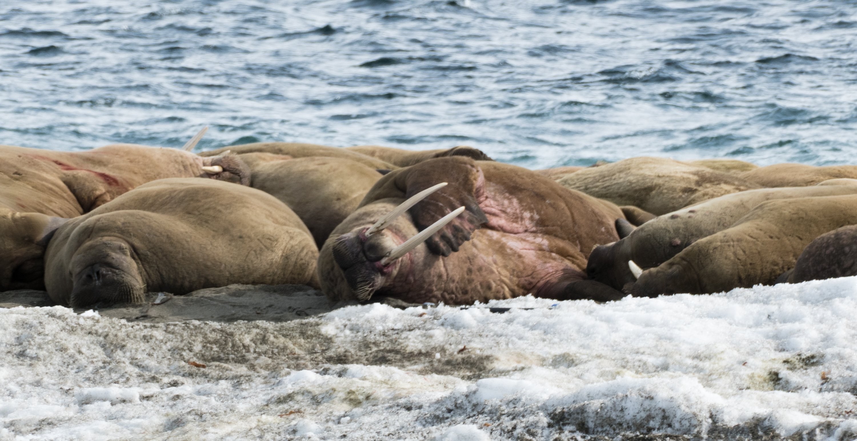 We spent most of today in Kongsfjorden, the northernmost fjord on the eastern side of Spitsbergen. The weather was warm and calm, and we had landings in both the morning and afternoon. In the morning, we landed in Signehamna Bay. Rolling hills on the landing site allowed staff to set a broad perimeter controlled by a few polar bear guards. Guests had the opportunity to hike individually or in groups in any direction within this perimeter. It was a truly High Arctic landscape with ice- and snow-covered mountaintops in all directions. Most of the vegetation was moss and lichen cover with a few species of flowering plants typically no higher than one cm. The snow patches scattered around these hills were rapidly melting, creating thousands of little streams. After lunch, we moved to another beautiful location within the eastern branch of the same fiord system, close to the Fourteenth of July Glacier. Here guests had three options: hiking (strenuous or moderate) or Zodiac cruising along the glacial edge. The strenuous hike was to the top of a mountain ridge about 400-500 m above the water level. The moderate hike was along a shoreline below a magnificent cliff where several reindeers were foraging. A black-footed kittiwake colony occupied another part of the cliff. Close to the landing site, guests observed a rare Arctic fox den in a snowbank. These dens are not rare because Arctic foxes rarely dig dens in snow; rather, the dens are ephemeral and can only be observed for short periods in the spring. Swimming along the shore, walruses presented another attraction for the enjoyment of guests on the moderate hike.