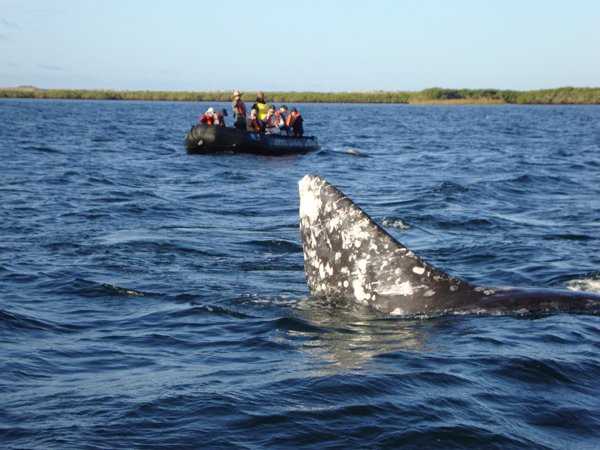 This morning, National Geographic Venture docked at the interesting port, San Carlos. From the 1940s to the 1990s, the port was used for loading agricultural products and fertilizers from the nearby Santo Domingo Valley. Nowadays, San Carlos is basically a place for loading sardines from a local cannery. It is also an important tourist base for whale-watching, principally mating gray whales. At the port, all guests and staff boarded buses to Lopez Mateos, a town located near the northernmost tip of Magdalena Island. The buses traveled across Magdalena Plain, a section of the Sonoran Desert that receives a lot of moisture in the form of dense fog from the Pacific Ocean. Lichens and orchillas, a type of flowering plant, give the desert a phantasmagoric appearance. Guests and staff enjoyed spotting numerous birds, including crested caracaras and kestrels. Once in Lopez Mateos, we boarded local pangas for whale-watching. During two rounds of whale-watching, we encountered several whales close to our pangas. However, most of the whales were preoccupied with traveling, searching for mates, or just finishing their time of reproduction and thus exiting the lagoon. In reality, the whales were not interested in interacting with the boats and their excited cargo, but we had many opportunities to observe the behavior of these magnificent animals. In town, we all delighted in a delicious fish lunch, ‘pescado zarandeado.’ We enjoyed exploring the local dock with its many colorful shops and crafts, and we admired the wonderful sculpture of a cow-calf pair of gray whales.