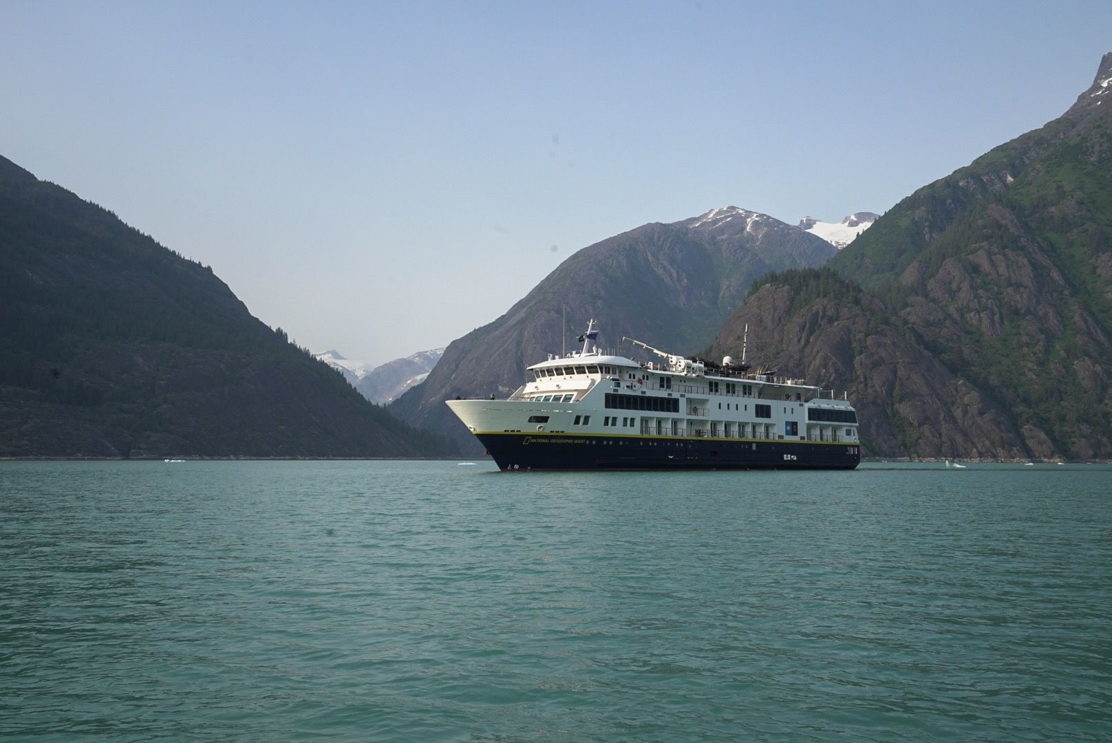 During the morning, we explored the scenic cove of Pavlof’s Harbor on the southeast shore of Freshwater Bay, Chichagof Island, and area known for its healthy salmon stream. We were optimistic that we might still see a bear during our last day exploring Southeast Alaska. We were not disappointed! At the base of a small waterfall, we spotted a coastal brown bear casually gorging itself on salmon as we watched, spellbound, from the safety of our expedition landing crafts only a few yards away. The bear, enjoying its meal, seemed oblivious or at least indifferent to our presence. For nearly an hour, we watched the animal devour fish after fish until it calmly walked up the river bank rocks and into the forest. Late summer and early fall is the time to fatten up and prepare for the long winter ahead. Come November and the onset of snow, brown bears will leave the coastline and head to higher elevations near or above treeline. Biologists debate whether bears truly hibernate or just den up and sleep during the winter. Pregnant sows will give birth to tiny, one-pound cubs while sleeping within the den and nurse them until spring. We returned to the ship after our morning adventures for lunch and were relaxing in the lounge when another bear was spotted on the beach south of Pavlof Harbor. Although more distant than our first encounter, we all enjoyed another exceptional sighting of a coastal brown bear. But the wildlife viewing wasn’t over yet! As we sailed south along Chatham Strait, we encountered a pod of killer whales swimming nearby. Crusing alongside the pod, we counted a group of about ten that included one large male. His large dorsal fin rose nearly six feet above the water‘s surface. Guests spent the remaining time reading or chatting with friends. We wrapped up our day with the captain‘s dinner followed by the guest photo slideshow, which we enjoyed as we sailed toward Sitka through Peril Strait. Have we seen it all? Hardly! But we left with a sense of fulfillment, knowing that we saw a lot! And maybe one day we‘ll return and finally see some elusive moose!