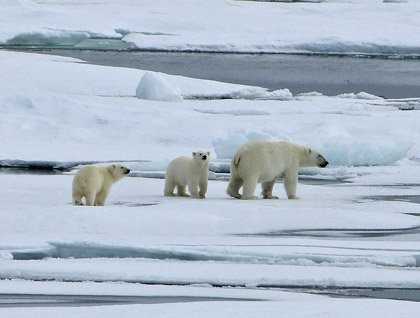 It was a day spent on deck, at our favorite perches, with occasional forays into the Chart Room for a warm-up of hot coffee or cocoa and a respite from the brisk Arctic wind. What set this day aside from our previous experience in the ice was the number of female bears seen with their young. Female polar bears have a problem. They must find the food needed to nourish their offspring, through their milk for young (first year) cubs or through shared prey for older cubs (yearlings). But hunting on the ice brings them into contact with male bears that pose a risk to the young. The smaller the areas of residual ice, the greater the concentration of male bears and the greater the risk to the young. The females appeared more wary than the males. We watched a female rapidly lead her yearling cubs away as a male bear approached. He followed, until he was distracted by a fourth bear. We will never know the outcome. Was he waiting for her to capture a seal that he would then take over, profiting from her hunting skill but sending her and her cubs away hungry? Did he lose interest and move on? Did she capture a seal, and will her cubs survive to independence?
