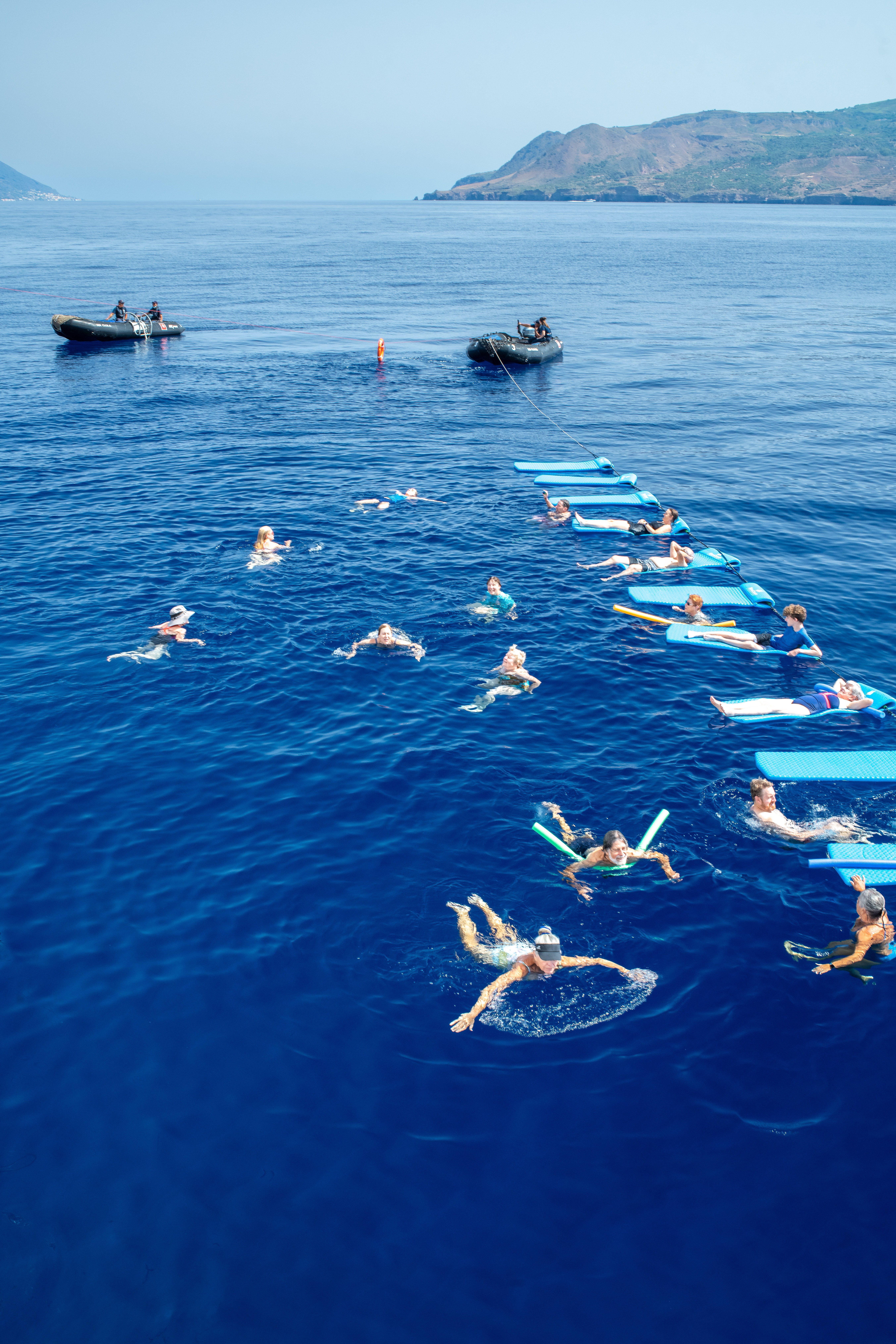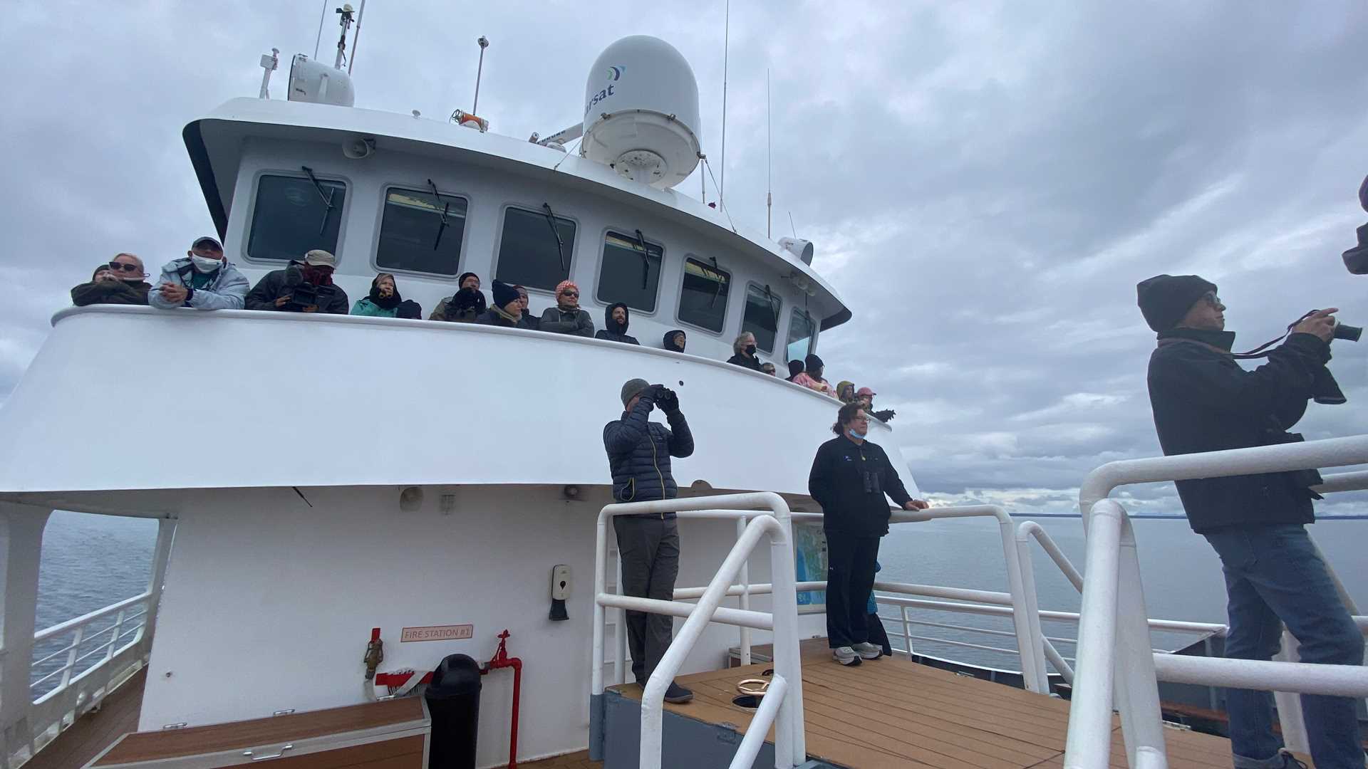 Today, National Geographic Sea Lion was en route to the Inian Islands in the morning. In the Icy Strait, we searched for wildlife along the way. We came across humpback whales. We anchored and put our Zodiacs in the water to explore. Anchored at Cross Sound, the Inian Islands sit at the confluence of Cross Sound and the Pacific Ocean. Taking a tour of the islands, we discovered abundant life at this intersection. In the evening, we visited the Tideline Institute. Zack Brown, the founder, gave a tour alongside a bonfire.