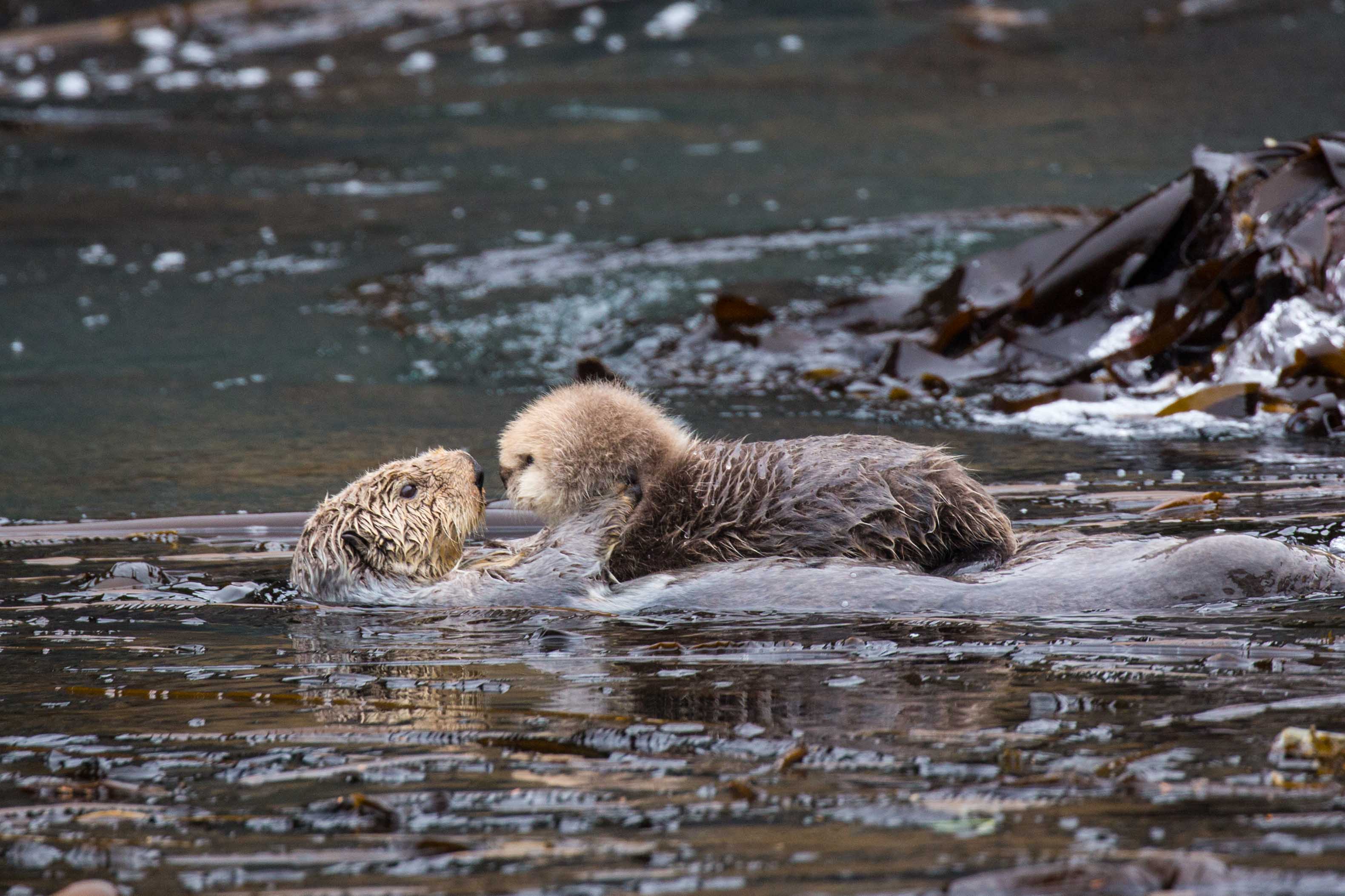 The impressive currents in this region that allow the bull kelp to thrive also bring with it sustenance in a variety of forms, most notably fish. Northern sea lions catch salmon, rockfish, and halibut, anything that is funneled from the expanse of the ocean into these comparably narrow rocky channels. Thrashing their caught prey back and forth to rip it into more swallowable chunks attracts a multitude of gulls, eagerly looking for scraps. As we careened about the swirling eddies and whirlpools of water in our inflatable boats, these massive pinnipeds, some weighing well over a thousand pounds, made a show of barely showing interest despite continuous close passes. However impressive a show these blubbery behemoths put on the animals that stole the show for the day were the sea otters. Observing them gnawing away at basket stars and urchins, swimming with pups on their bellies or wrapped up in kelp sleeping, these marine weasels captivated our attention utterly. One’s mind and memory card are quickly filled up with how precocious they were behaving. As exciting as looking at lichens, tiptoeing around tidepools, and a killer kayak can be, sometimes you just can’t beat cute baby animals to really make your day…
