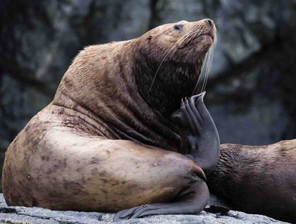 Today, it was salmon surging in on the rising tide, with hundreds of Steller sea lions cruising the waters to intercept their migration home. Violent splashes signaled a successful hunt: lacking hands to help rip the salmon’s flesh, sea lions thrash the fish into bite-sized chunks, while kittiwakes circle overhead looking for scraps. Curious and playful, the sea lions surfaced all around our boats, puffing fishy breath through their long whiskers. One young girl was captivated: “See that one! Oh, over there! They’re all around us, I don’t know which way to look!” As we made our way back to the ship, the sun needled through bursts of storm clouds, and we let it warm our faces while a bald eagle above us spread its wings to dry.