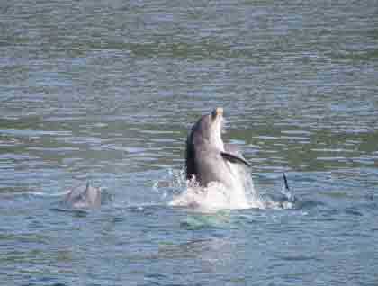 Lord of the Glens set off from Inverie on calm seas, bound for our last stop at the Kyle of Lochalsh. The day brightened and the sun shone as manx shearwaters and gannets ushered the boat along the way. Midmorning, Catherine began a presentation of her photographs but was interrupted by the appearance of a large pod of bottlenose dolphins. Over 20 dolphins surrounded the ship, gracefully rising then diving as they fished for mackerel. Occasionally, two or three dolphins would slap the water with their tails, and the pod would shift direction. We speculated that the tail-slapping communicated the direction that the fish moved, allowing the dolphins to closely follow the school. The boat paused while we watched the dolphins with delight, standing outside under blue skies.