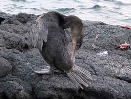 Back onboard and after lunch, and while we navigated to Fernandina Island, I talked about human history of the Galapagos. Afterwards we headed into Zodiacs to visit Punta Espinoza on Fernandina. Its surrealistic and barren landscape contrasted with the explosion of life found there. Everywhere we walked we observed a large number of marine iguanas whose black bodies looked as petrified as the rocks. On beaches, sea lions rested or nursed their babies and finally along the way, we could find our next non-flying bird, the flightless cormorant. We observed some on the rocks drying their wings and others in the water collecting algae or catching some fish. We felt as the marine breeze became fresh, the sunset along the west was calling all sea birds back to their nests and giving us a final view of this magical place: a whale in the distance with its unmistakable spray, and lot of shear waters trying to catch some food near the great creature. Finally we arrived back on board tired but happy, because we enjoyed this beautiful paradise called Galapagos.