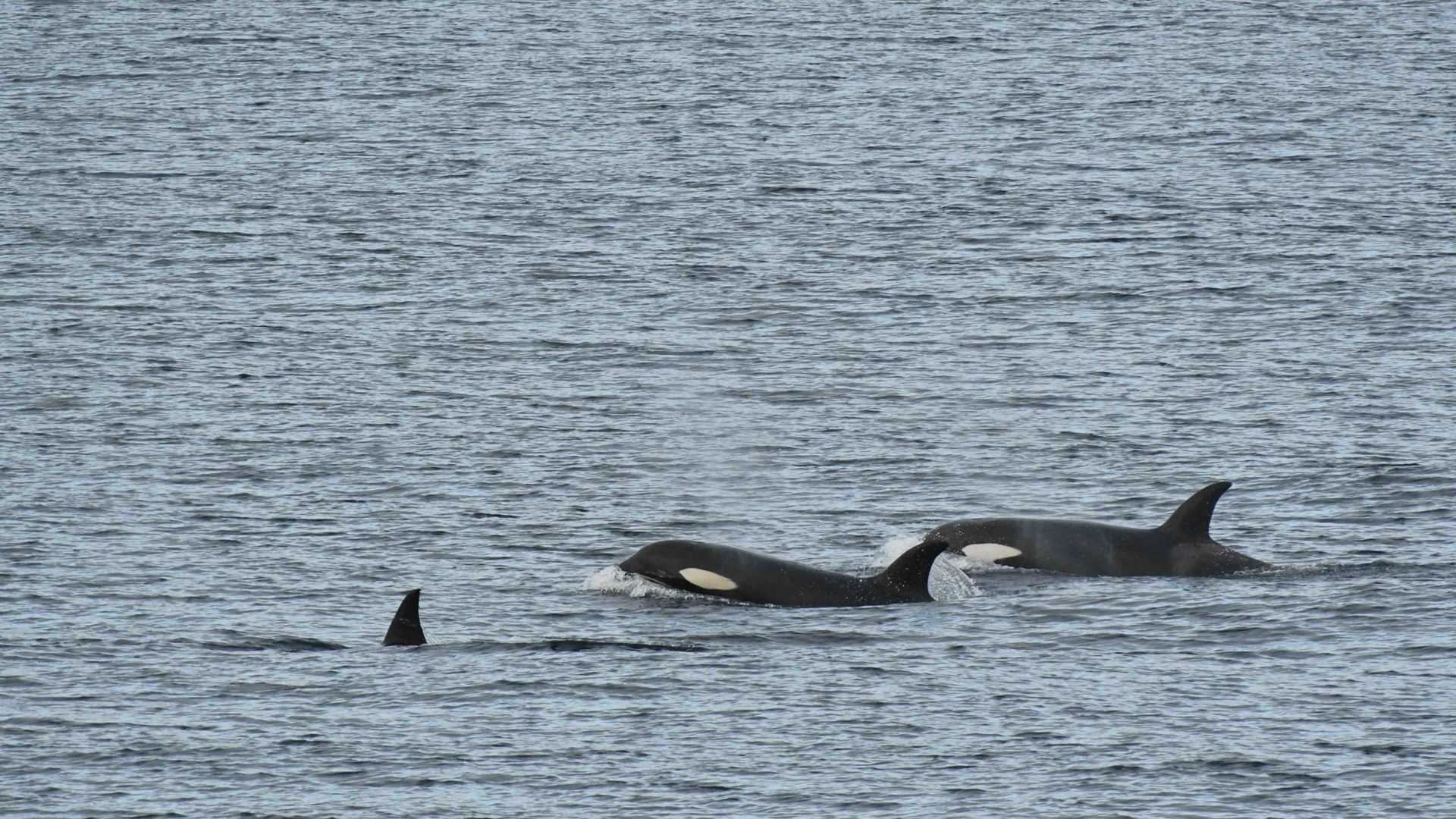 This morning we were off to an amazing start. Within 15 minutes of beginning our search for cetaceans, as we navigated along the northern shore of Isabela Island I spotted through my binoculars, far ahead of us, the tall black telltale fin of a large male orca! I made an excited ship-wide announcement to make sure no one was still sleeping and guests and crew hurried out on to the decks. There were seven whales: a big male, two large females, and four smaller animals. Three of the smaller whales played for a while, diving back and forth under the ship, and we raced from the port rail to the starboard rail in order to see them surface and blow! Our first mate, Giovanny, who was at the helm of National Geographic Islander, carefully approached the male and two females, and we had a good look as they crossed closely in front of our bow and then dove deep off our port side.