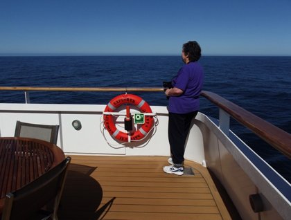 After breakfast, some of us went snorkeling and saw some white-tipped reef sharks and a large variety of tropical fish. The red rocky cliffs have created odd looking geological features that provide shade and shelter for the Galapagos fur seals (truly a sea lion). A Zodiac ride was also offered and while out there riding on the Zodiacs, we saw Nazca boobies, swallow-tailed gulls, and many shore birds.