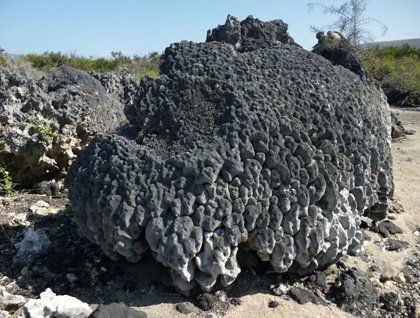 This morning we visited a very interesting site, called Urbina Bay. An area of about one and one half square kilometers of the marine reef along the coastline was uplifted some time ago, by as much as 15 feet! During the hike, we could see evidence of the occurrence: shells, barnacles, and sea worms attached to the rocks, small and huge coral heads, all spread throughout the trail. However, not only are the recent geological changes amazing, but the site itself is beautiful—the green vegetation dotted with yellow flowers is host to a great habitat for the herbivores of these remote Islands. Two young Galapagos Giant tortoises were spotted underneath the poison apple trees, and huge colorful land iguanas were all along the trail, as well as many Darwin finches and Galapagos mockingbirds. After the hike, most of our guests enjoyed a refreshing swim from the black sandy beach.