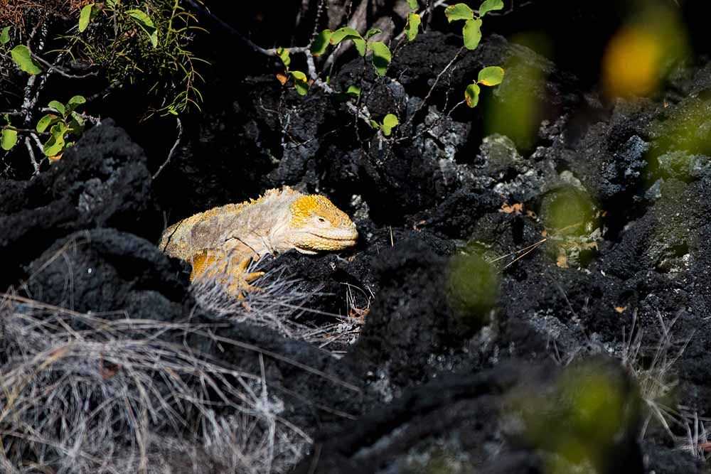 Our first sightings were flocks of Darwin’s finches feeding on the ground and others feeding on berries from the thorn bushes. This place, Volcán Alcedo is home to a large colony of yellow land iguanas. We spotted many iguanas guarding their burrows by the trail. Some of them were still resting and basking in the morning sun.