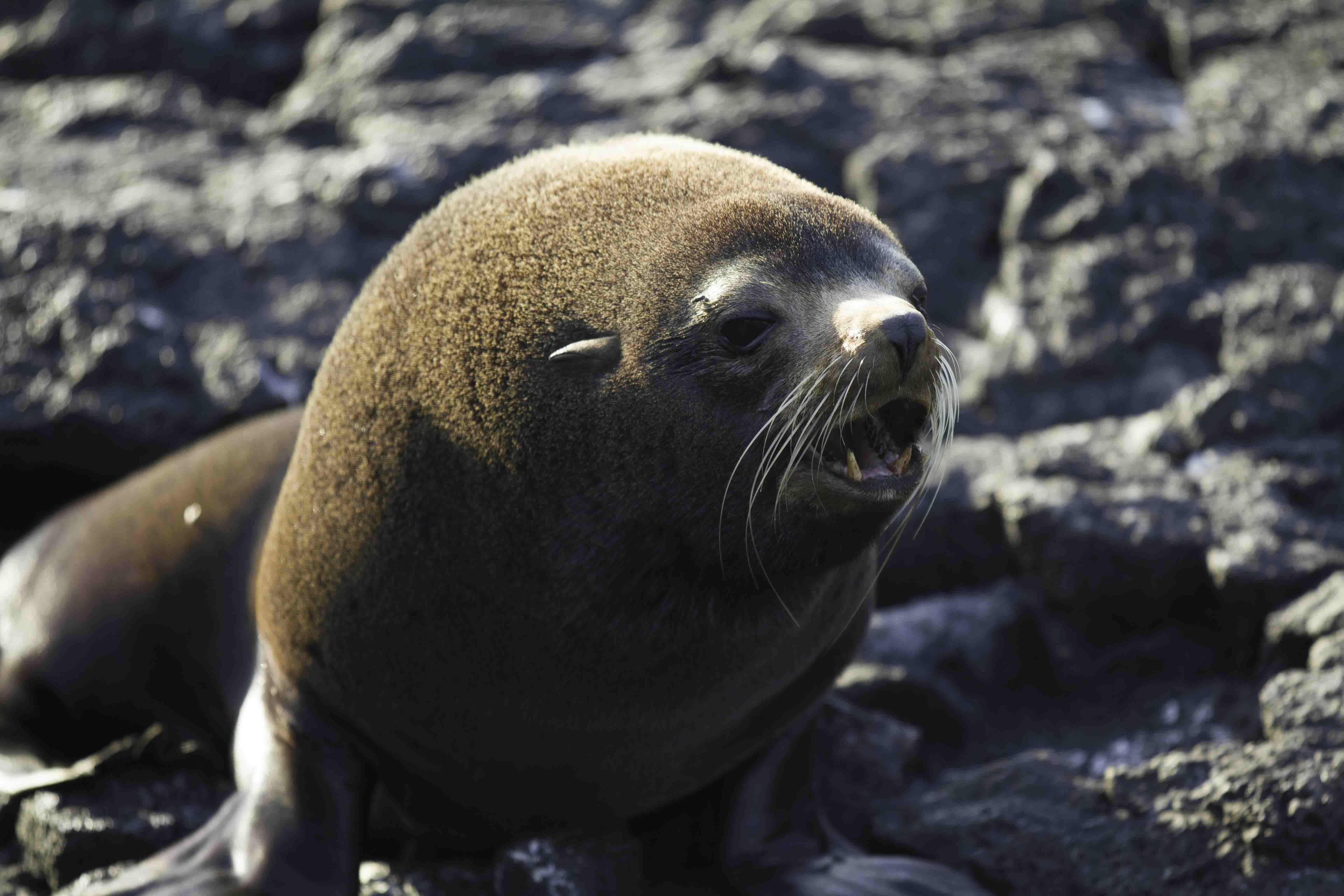 This time of the year, the western part of the Galapagos is colder and chillier with changing conditions, but today is the exception to the rule. This morning was warm, and the ocean looked very calm. At 8 o’clock we were to disembark, and as we headed to the black beach of Urbina Bay we suddenly spotted a female humpback whale with its baby. It was great to have these cetaceans so close to us. These enormous creatures are seen from time to time, especially this time of the year, when they migrate from Alaska all the way down to South America to mate and have their babies. We were very lucky with this encounter.