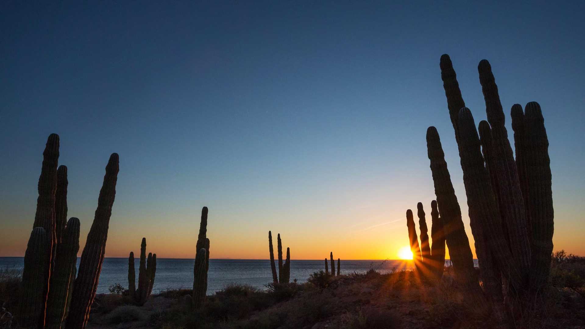 This morning on the National Geographic Sea Lion began with a pre-sunrise landing on Isla Angel de la Guarda in the Midriff Islands of the Sea of Cortez. Here we found ourselves in a gorgeous garden of cardon cactus against a stunning, rugged mountain backdrop. The striations of geologic colors and azure sea were beautiful punctuation to our morning ashore. As we walked further towards the steep walled canyon, we were delighted to find ourselves amid a sea of flowering lupine blossoms in shades of white, pink and blue. Our afternoon was spent at sea in search of marine mammals, finding a variety of seabirds feeding in these rich waters including brown and blue-footed boobies, and ending with a last-minute dramatic sunset over Isla Tiberon.