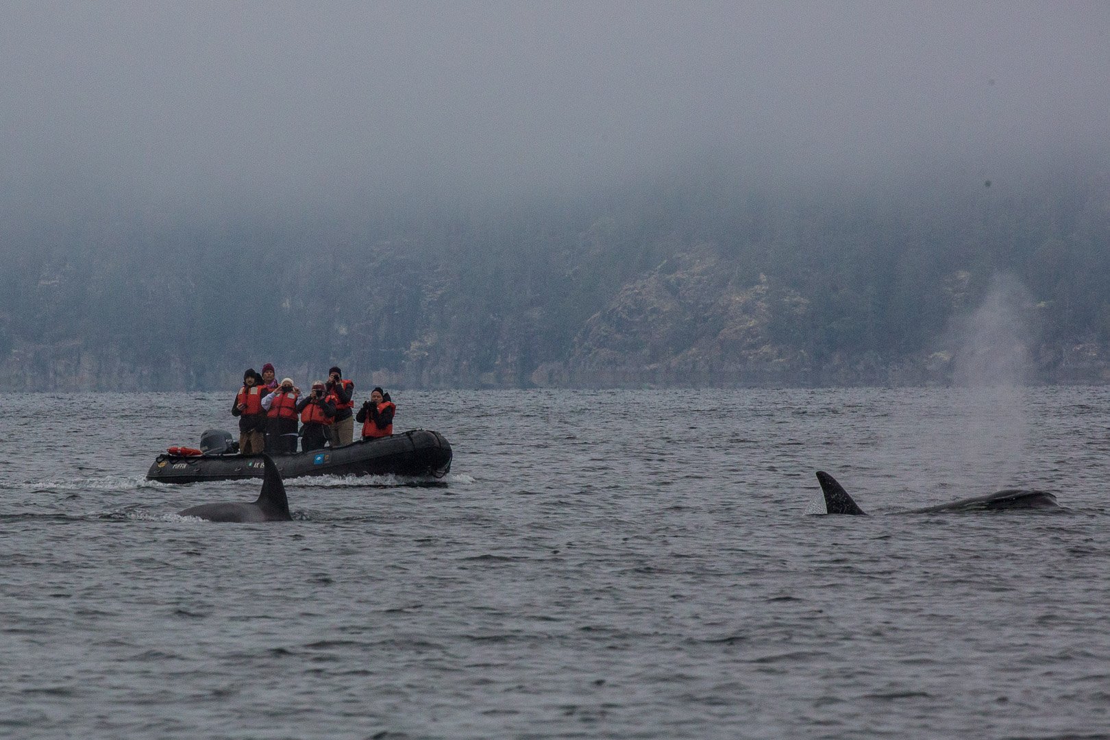 Franklin Bay, our first stop in the morning, proved to be too much for us to make a landing. Winds gusting to 50 knots are regular in these latitudes and we had to go to plan B. Cánepa Bay proved to be well-protected from the “furious fifties” and we explored this magnificent fjord system for several hours. In the afternoon our plans to visit another location were interrupted by a group of killer whales that was prowling the rocky coasts where several hundred South American fur seals were resting, afraid of getting into the water. After an hour of quiet observation, the whales finally decided to catch one of the seals, right under our bow! The day ended on the sheltered waters of Puerto Cook, our intended destination for tomorrow morning.