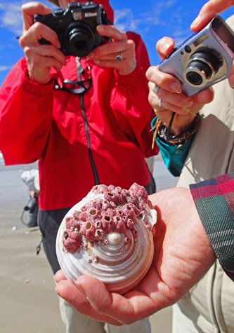 Delicate mouse tracks wove through the protective shelter of sea purslane, iodine bush, and sand verbena hummocks. On the Pacific side of the island we found tun shells, long washed ashore, ornamented with bubblegum pink expired barnacles. Bones of sea lions, pelicans, sea turtles, and piles of sun bleached sand dollars tossed ashore by the surf of the Pacific Ocean all vied for our attentions.