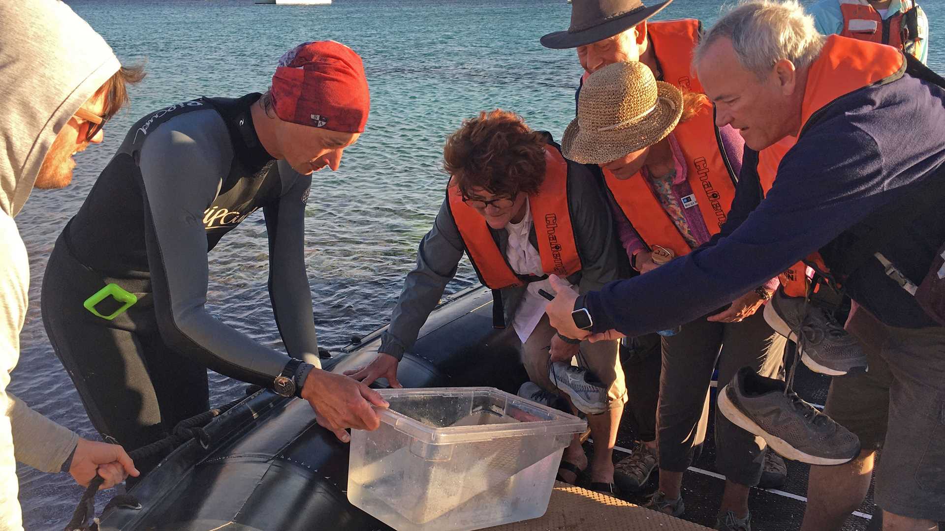 We arrived at Half Moon Bay at daybreak. The sun was rising, and the full moon was setting over the dramatic mountains of the Baja California Peninsula. We spent the entire day exploring the bay—kayaking, paddleboarding and snorkeling. Naturalists and the photographic instructor offered guided, leisurely walks through salt flats, as well as hikes up a rocky ridge. From the top, we were rewarded with beautiful views overlooking Half Moon Bay.