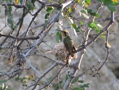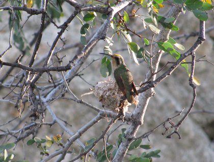 Serenades by verdins in the trees, staccato chatter of gila and ladder-backed woodpeckers, and asthmatic wheezing sounds from gnatcatchers caught our auditory attentions. As we returned beach ward, the zippy flight and chitchat of a hummingbird turned heads upward. The reward was three-fold; a stunning view of an endemic Xantus’s hummingbird, her spider webbed nest perched up in the branches of the Palo Blanco tree, and the crowning highlight, the female Xantus’s coming to the nest and feeding in sword-swallowing fashion a single chick.