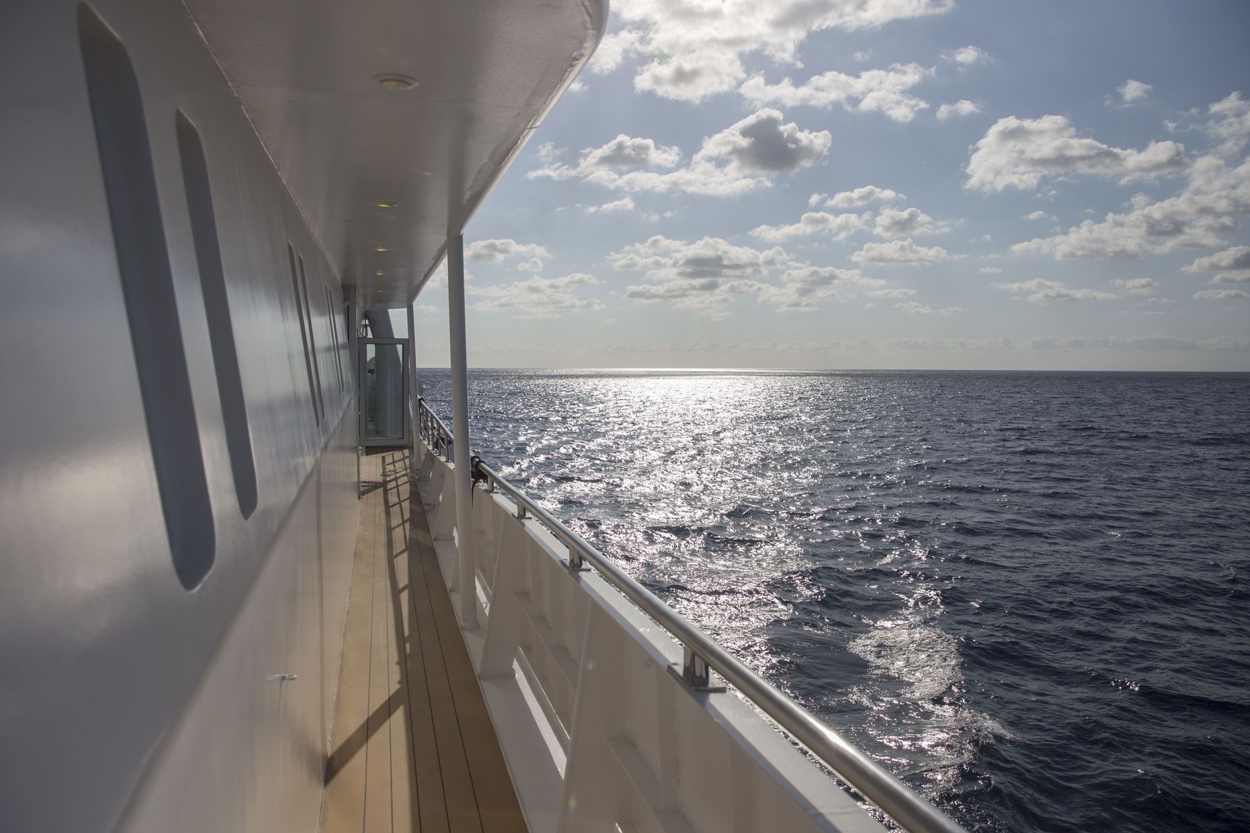 A beautiful sunrise across the peninsular range greeted us as we cruised the San Jose Channel this morning. We spotted a large pod of common dolphins surfing in the wake of our ship. Afterward, we came ashore at Puerto Los Gatos on the mainland of the peninsula. We hiked through the desert arroyo and summited a peak overlooking the bay. As we explored the shoreline of this remote coast, pink rocks of lithified sand dunes served as a striking backdrop for our peaceful morning. Guests snapped triumphant photos while taking in the whole of the arroyo’s ecosystem. During lunch, we repositioned the ship toward Isla San Jose. We spent our last afternoon in the protected waters of Kelly’s Beach. We enjoyed kayaking and SUPing, or stand up paddleboarding. Our small travel group became quite close over these last four days. We encountered a mix of emotions as we recounted our trip and prepared to say goodbye. I hope we will sail again together soon, and from all of us here aboard National Geographic Venture , we wish you safe travels!