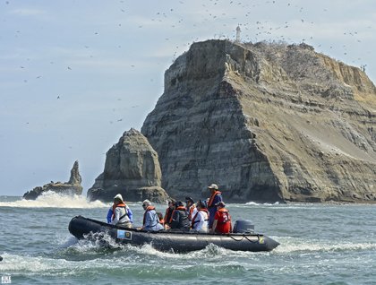 As we get closer to the island we quickly understand why these islands have been protected since 1999. The sky is filled with birds soaring and flying and many thousands scattered throughout the main island. The top of the land has a crest of dry trees, they also are covered with perching frigatebirds. With our binoculars it is possible to occasionally see little dots of red among the birds, denoting inflated gular pouches on the male frigatebirds. There are other birds sighted such as brown pelicans, blue-footed boobies, laughing gulls, and terns, including the occasional spectacular Inca tern.