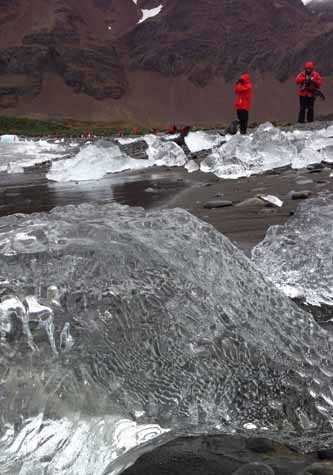 It was windy and cold outside but we were out playing with the crystal clear bergy bits on the beach anyway, since this is what we do. Occasionally, we see the odd creature during our wanderings but this morning was a bit different. First of all, there was this large berg floating on the bay that had a yellow line painted around. Out of it came smaller black bergs with figures much like the penguins we regularly see on the beach but wearing something red and bright. We had no idea what they were until “Old” Eli, who had seen a lot of them, told us stories about these funny creatures that come every summer. They have very strange behaviors, these visitors, pointing flashy things at us and talking to us like we could understand them… but they seem to be harmless and very easily scared with a “warf warf” call. We tried to make them go into the water to play with us but they did not seem to like it, despite it being very warm today! A very strange type of seal they are, they don’t have fur or blubber and they don’t like to swim…