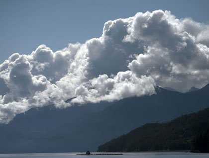 As if on call we heard the radios begin to chatter...Killer whales had been spotted! We were all called to the bow to watch a group of northern residents as they made their way along the inside of Vancouver Island in Johnstone Strait. A small group of 4 or 5 whales dove, surfaced and moved close to the shoreline. One younger animal was seen again and again, surfacing very close to its mother. Killer whales are matrilineal and this group was probably a matriline or small group of Killer whales with one female as the central figure. They remained with us for the entire morning casually taking their time while moving north in the same direction as the Sea Lion.