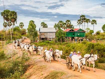 A welcome cloud cover eased us into the dawn, as we hiked up the riverbank to Kampong Tralach, or “the Embankment of the Winter Melon” with the rising sun. We were all a little skeptical about this morning’s adventure, where the village families had organized their oxcarts to meet us and take us two-by-two through the rice paddies and lotus fields. What an adventure it was! We rolled through the rice fields in a long, peaceful caravan, surprised at the silence and tranquility. In “the middle of nowhere” we stopped and dismounted, to see an expanse of beautiful lotus flowers rising from the muddy ponds in front of us. It was easy to see why these were the holy flowers of Buddhism, rising up from the mud in their delicate elegance. Photographers hurried to the lotus ponds, trying to get macro shots without getting sucked into the mud. Children gathered at the fringes to demonstrate the many ways to fold the petals, and we continued our oxcart journey with gorgeous bouquets of lotus flowers and pods in hand.