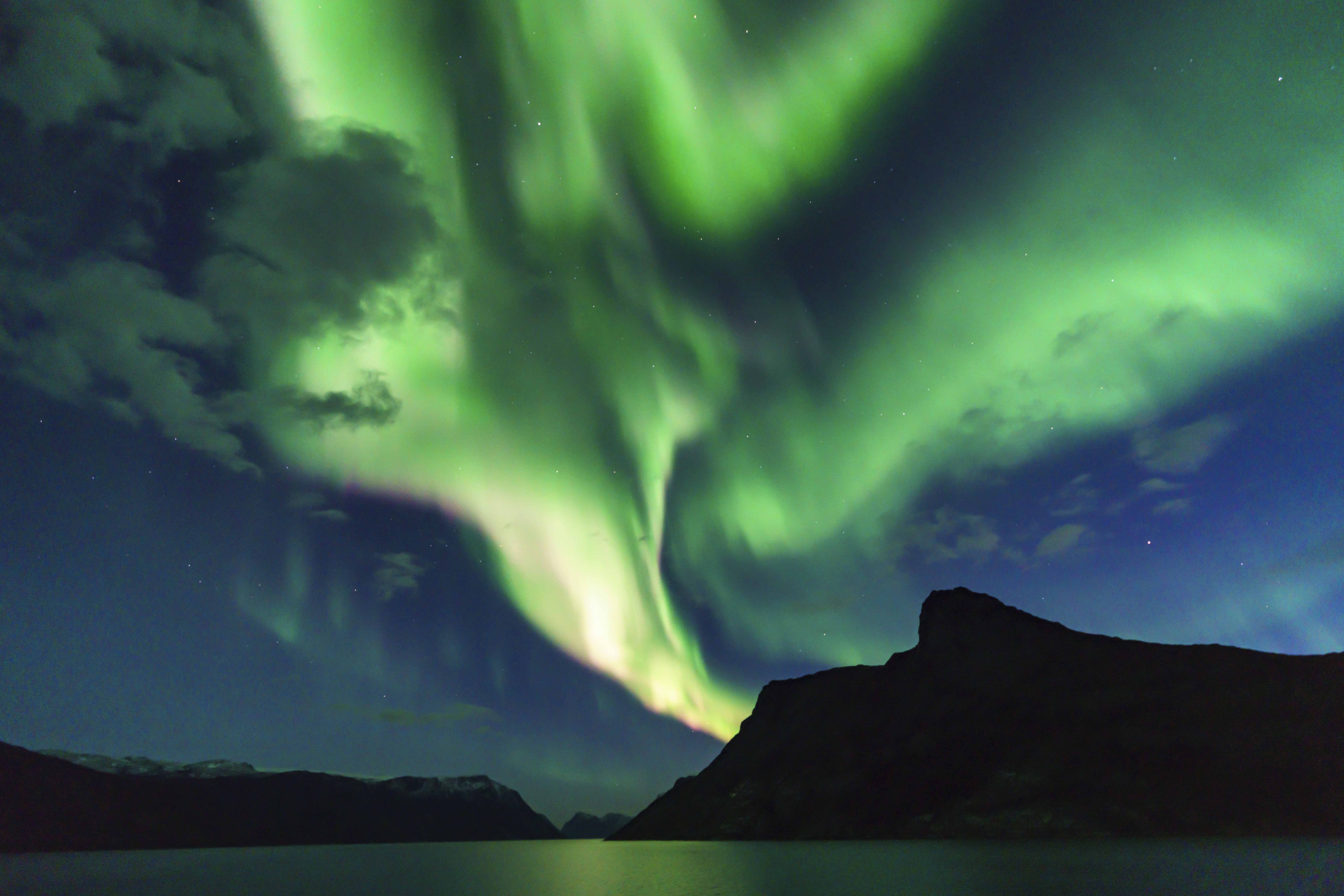 After some great days of expedition in Iceland, we arrived in Greenland to incredible weather and scenery. It was not yet totally dark when the call come up: “We have something special dancing in the skies—you can’t miss this!” We were treated to a spectacular show of the aurora. The greens, reds, and yellows of the northern lights painted the skies all around the ship. It was simply unbelievable! In the morning, we were in Sisimiut, the second biggest town in Greenland, with about 5,000 inhabitants. Fishing for shrimp, cod, and haddock is the main industry. This town has the privilege of having a port that does not freeze over the winter; it’s accessible by sea all year-round. Our morning was spent exploring this colorful town with local inhabitants. Some of us adventured on a nature hike to the outskirts of Sisimiut. In former times, the Inuits only wore clothes made from animal hides or skins. These clothes were warm and hardwearing, and if properly looked after, could cope with the winter’s freezing temperatures in the Arctic region. Before contact with the outside world, the Inuits did not have access to fabrics and beads—all clothing was made from skins of seal, polar bear, reindeer, foxes, rabbits, and dogs. Both men’s and women’s clothes consisted of furs, trousers, and boots, but with different cut and choice of animal skin. The West Greenlandic outfit for the women is very colourful. They use sealskin for the kamiks, as well as embroidery and dyed sealskin leather, cut into small pieces, called avittat. The pants are almost shorts and are also made of sealskin and avittat. The anorak is made of fabric and features a complicated design with a beautiful pearl collar. In the afternoon, we visited a local clothing school for the crafting of traditional products. The details, the creativity, and the patience to produce such pieces is fascinating. We also saw a local Inuit man perform an astonishing kayak demonstration right next to National Geographic Explorer . One would think the day was almost at the end, but we were thrilled to see the second-largest cetacean in the world, the fin whale (which can travel at 48km/h) swimming just next to our ship. What a day!