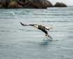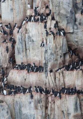 We awoke this morning at the bird cliffs of Alkefjellet at Kapp Fanshawe, on the west side of the Hinlopen Strait near Lomfjorden. The weather was a bit colder than we had experienced so far, so we donned our warm gear and headed outside before breakfast. As the ship travelled along the cliffs, we were able to observe hundreds of thousands of birds as they nested and rested, flew all around us, dove for food, took off from the water with wings flapping furiously, and landed in the water with legs splayed wide. Our main feathered friend at the cliffs was the Brunnich’s Guillemot, a black and white auk. These birds lay their eggs directly on the cliff ledges and can dive up to 300 feet into the ocean to find food. The sights and sounds of this extremely large nesting colony were an amazing way to start our day.