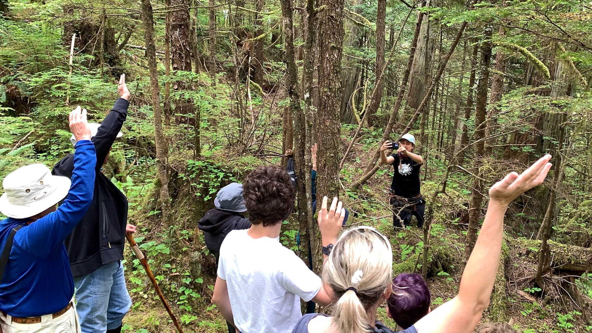As National Geographic Sea Bird transited Sumner Strait this morning, we awoke to the gentle urging of expedition leader John Pachuta: “Time to rise for a lovely day in Southeast Alaska, and by the way, a humpback whale is sighted off the bow. While this visit by the massive predator of the Inland Passage was brief, it presaged a day full of magnificent sights and a wide range of activities on land and sea. We found a safe anchorage in a narrow cove amidst densely forested islands, rugged islets capped with tall trees, and intertidal rocky reefs. We were ready for a day of exploration.