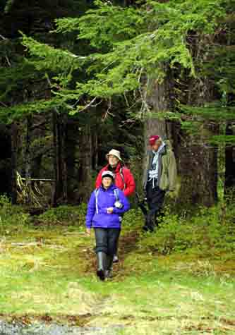 Later, out on the bow of the National Geographic Sea Bird with the chilly south wind happily at our backs, we scanned Chatham Strait and Chichigof Island for wildlife. Andy, our resident whale expert, sighted the tall black dorsal fin of a male killer whale and the afternoon’s excitement began. There were about six animals, likely a group of ‘resident’ or fish eating whales. Captain Kay deftly maneuvered our small vessel and we all enjoyed great looks at these exciting large dolphins. On the shore Justin spotted a large brown bear working the intertidal. The bears have recently come down the mountain from their dens above treeline and started foraging on the green shoots of sedges, roots, and pretty much anything they can find after their five-month-long fast. Salmon will begin to fill the streams in mid-July, but until then, the bears will have to get by on a rather spare diet.