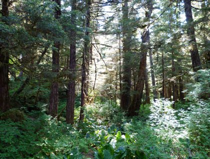 For our afternoon activities, we reached Hanus Bay, near the northeast corner of Baranof Island, where we took our first walks through the magnificent temperate rain forest. The climate of Southeast Alaska is moderated by the influence of Pacific Ocean water. It is neither warm in summer nor cold in winter, hence "temperate." Huge trees of Sitka spruce and western hemlock, both reaching 200 feet in height, dominate the forest. But one of the diagnostic features of the rain forest is the abundance of living plant biomass at all levels of the forest. A carpet of moss, ferns, and tiny flowering plants covers the forest floor. Above these are small shrubs, then larger shrubs like bush blueberry and huckleberry. Then come the tree saplings and young trees, and above these is the canopy of mature trees. Collectively, these make up a mass of green tissue (biomass) that meets or exceeds the rest of the world's ecosystems. Looking out through the forest, we saw shafts of sunlight coming through light gaps, perhaps where a canopy-level tree had died and fallen, to allow light to reach the forest floor. We saw abundant evidence of the recruitment of new trees on nurse logs—fallen trees, now moss covered and providing a perfect seed bed for the next generation of forest trees.