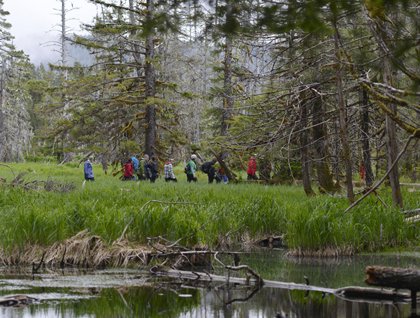 Just after breakfast we took our rubber boats ashore to Pond Island. Here we stepped into temperate rain forest. Moss carpeted the forest floor, soft underfoot, and trees reached out of sight to a gentle grey sky. We met the common trees of the Tongass National Forest – spruce, hemlock, and alder. Beneath these hunkered ferns and huckleberry. We heard songbirds tweedling from the treetops – warblers, kinglets and thrushes. We found meadows of sedge clipped by the dainty mouths of deer and an impressive bear track. Many of us followed a rugged trail over and under fallen logs to a series of beaver dams. Here we found one of early summer’s delights – the calypso orchid. This rare flower is as bright and intricate as any corsage. In twenty years, I have never seen these flowers elsewhere in Alaska – an indication that Southeast Alaskan forest, while homogeneous at first glance, is really full of intricacy and nuance.