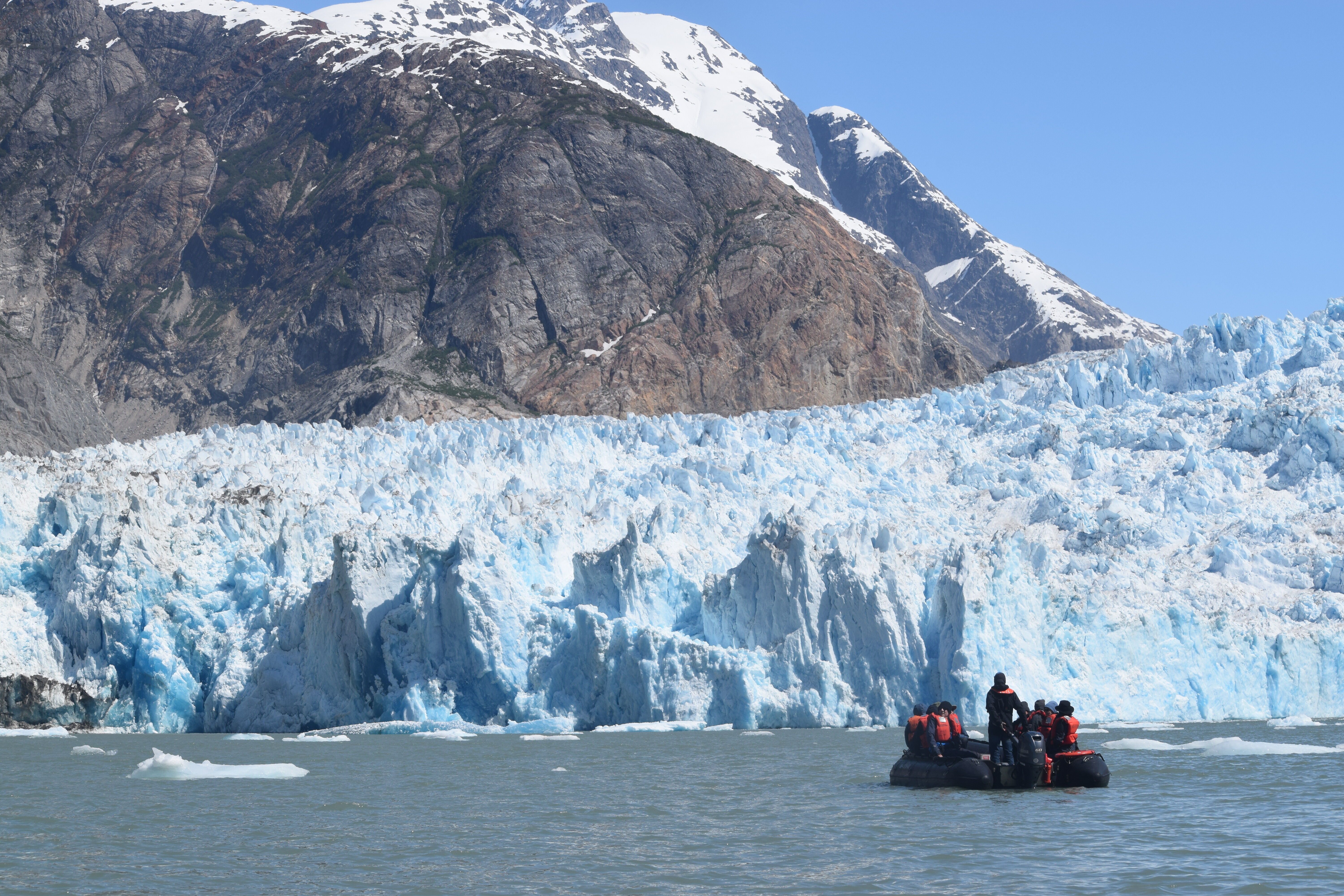 Eating breakfast in the dining room of National Geographic Quest, there are often remarkable views, and this morning was no exception. Off the stern of the ship, we were treated to a stunning view of Kasnyku Falls, a beautiful cascading waterfall in picturesque Alaska. It’s hard to imagine Southeast Alaska as a temperate rainforest with all the sunshine we’ve been treated to this week, especially since once again the skies are blue, the sun is shining, and people are even out on deck in shorts!