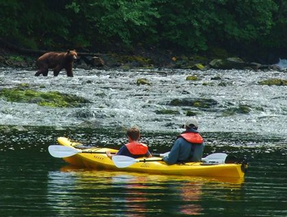 There was still plenty of time to look for bears—after all it’s the first morning of the first day of our trip. The persistence of our naturalists on the bow paid off. Mid-morning, towards the end of a discussion on photography, came the news that there was a brown bear on the shoreline! Grabbing binoculars and cameras and rain jackets (it was raining), people poured onto the decks to see the first brown bear of the trip. And not long after lunch began, the PA crackled with the announcement of another brown bear along the shore. Our afternoon explorations at Pavlof Harbor brought many people into closer view of brown bears. A few groups of hikers almost ran into a bear on the trail—!!—heading towards the landing beach (though we never did see it arrive there). Then a little later a sow and her cub were seen hunting salmon by the waterfall. Walkers, kayakers, and expedition landing craft cruisers observed at a safe distance until these two bears disappeared back into the forest. Walkers continued on (carefully!) to test rubber boots with mud and roots, and begin learning about this pristine temperate rain forest. Paddlers fanned out to explore the further ends of the bay.