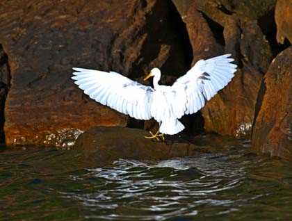 Meanwhile down below, Zodiacs explored the rocky coastline with many great sightings, including white-bellied sea eagles building a nest on a rock promontory and a Brahminy kite fishing right in front of the falls. Other sightings included several peregrine falcons and a number of egrets and herons perched in the mangrove trees, we also spotted a saltwater crocodile perched on a rock soaking up the last of the afternoon sun.