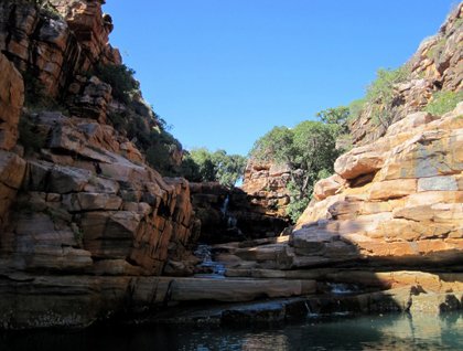 Koolama Bay is also where the entrance to the King George River is located. Today we spent the entire day exploring this scenic waterway. Cliffs of Precambrian Warton Sandstone rise steeply above sea level, culminating in the 80-meter-high twin falls at the far reaches of the estuary. We marveled at the amazing rock formations and erosional patterns in the almost two billion-year-old layers of sedimentary rock, painted orange by eons of oxidation due to the high content of iron in the rock