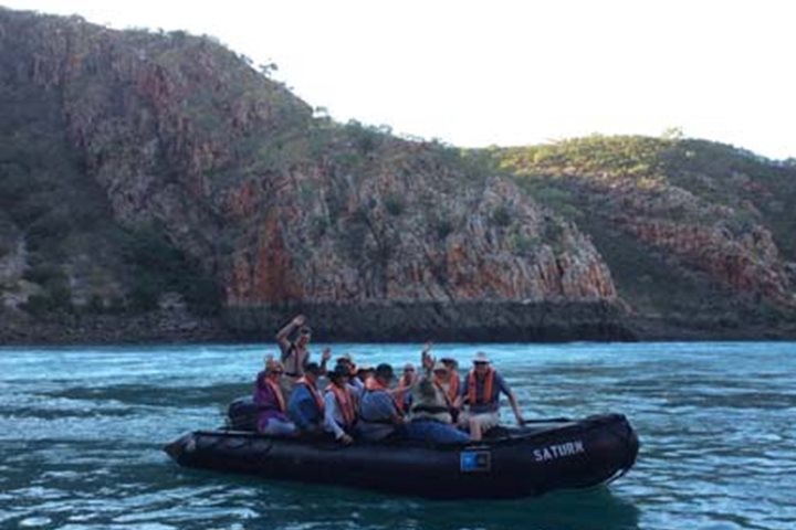 With the hard work of discovery and surveying taken care of, we were able to safely enjoy the transit from our anchorage in Koolama Bay to King George Falls. A mere one meter tide kept all submerged rocks well protected as we snaked our Zodiacs through the burnt orange sandstone canyonlands and verdant green mangroves of the river system. White-bellied sea eagles and their enormous nests clung to the edge of this sheer landscape as its size and scale was constantly reinforced by our seemingly tiny zodiacs. Eighty meter vertical walls rose from river level, worn and weathered as if a miniature (and hyperactive) community of Anasazi Indians built their tiny homes within its very walls.