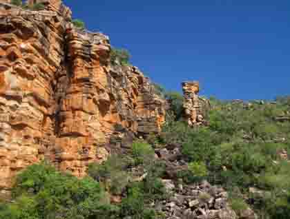 The early starters headed out on their six hour tour towards the King George River, a spectacular fourteen kilometer gorge cut into a one hundred meter high sandstone plateau. Up above our heads a large sea eagle with a fish in its tallons flew by us, as we marveled at the amazing rock formations and erosional patterns in the almost two billion-year-old layers of sedimentary rock, painted orange by eons of oxidation due to the high content of iron. We then made our way to the eighty meter high falls and started our hike to the top of the falls. Once at the top we were able to enjoy the scenic beauty of the lookout and watch the other Zodiacs down below navigating their way to the falls.