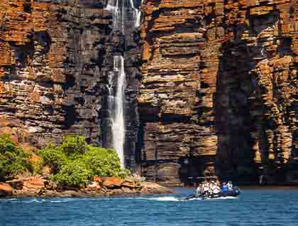 Zodiacs take us up the ria, poking into countless scenic coves, inlets and fissures in the sandstone. Viewing the falls from our small boats gives an impressive perspective. We are small. Lighting evolves through the day and is augmented by shadows and the smoke from a prescribed burn along the top of the cliff. Hearty hikers boulder hop to the top of the falls and enjoy a well-earned refreshing swim in a pool of cool water. The view from above is amazing. Just below the falls, a well-hidden Zodiac captained by our maître d’ Sam, full of good cheer, hands out greatly appreciated drinks and snacks.