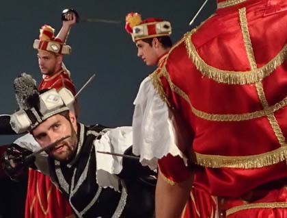 We continued our walks through the narrow lanes of the city, some not wider than six feet and admired the many stone balconies and the occasional stone bridge connecting homes at the 2nd or 3rd story. The stone of the buildings is uniformly a soft honey-white limestone and the architecture of the entire city is deeply indebted to Venice, which controlled Korcula for 400 years. We then walked to the city center where we were treated to a unique theatrical performance and dance called “Moreska.” The dance reenacts the seizure of a beautiful young princess by the Black Knights, who represent the Turks, and her rescue by the White Knights, the Croats. The men danced furiously in great circles and fought spirited sword battles. On a number of occasions when they clashed sparks flew from the swords. I saw one young man who had to bandage his hand, presumably from a blow. One of the dancer’s tiny 4-year-old daughter sat in the first row by herself, cradling a small stuffed animal, and waved continually to her dad. You could see the pride in her face.